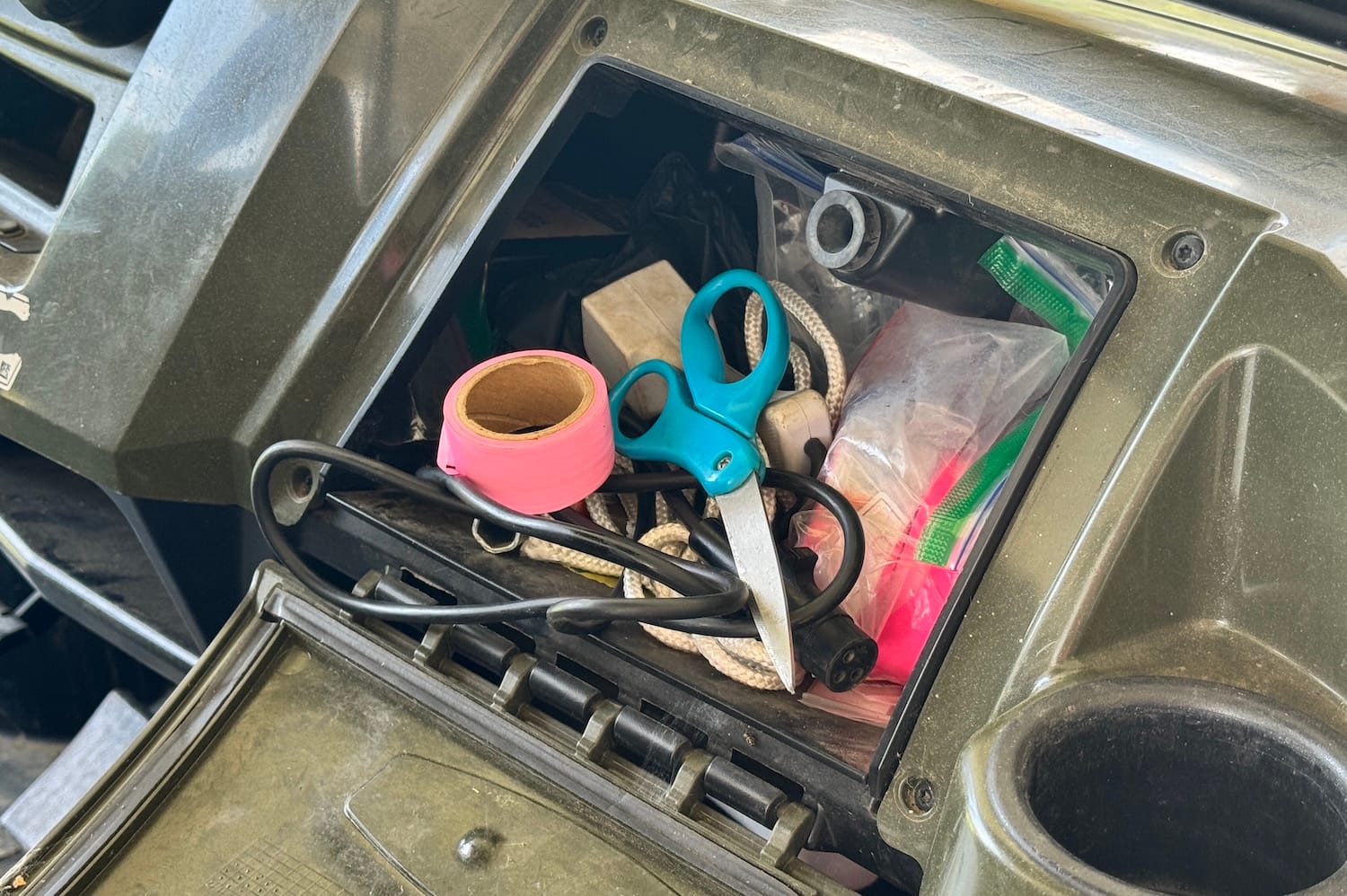 This might sound like a small thing, but it’s a huge time-saver. We keep a pair of scissors and pink marking tape right in the glove box. I love being able to snip a beautiful flower and take it up to the house if I find something special growing in the nursery. Or, if I’m out in the on the back side of the farm and find a unique flower or tree, I can mark them with the marking tape so I can find it later. It’s a simple thing that just makes life a little bit easier and more spontaneous.