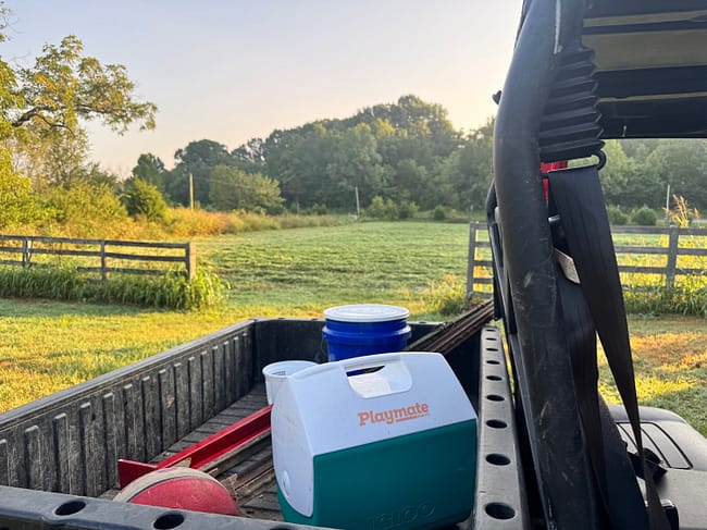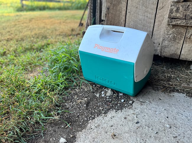 We started with a regular cooler, but the lid kept popping off and spilling all our water. We quickly learned to get one with a tight-closing lid that fits perfectly in the back of the vehicle. We refill it every morning before we head out to the barn or over to where we’re planting some fruit trees. It’s so nice to have cold water on hand without having to run all the way back to the house.