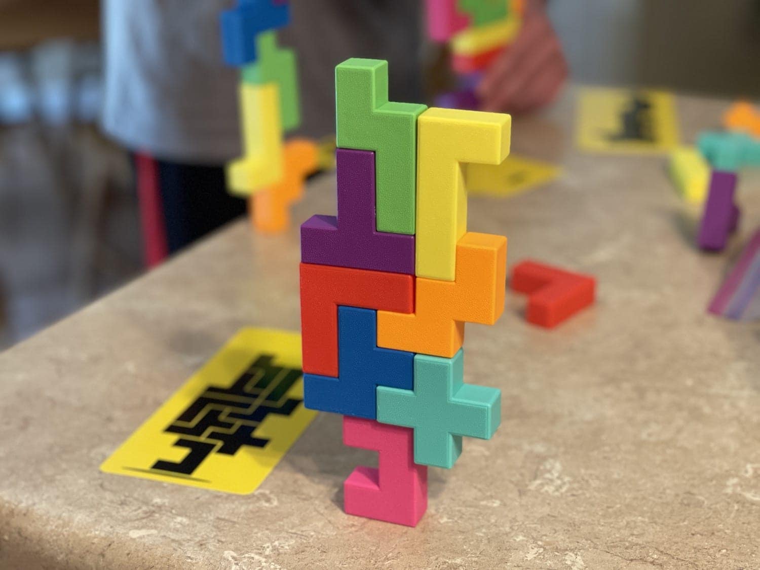 Flip over your Tower Card or Block Card and be the first to build your block tower. For more of a challenging tower game try using the yellow/black side of the Tower Card, these towers are a bit trickier to build and don’t have colors to help identify the blocks. You can also use the individual cards to mix things up and make the game even more challenging.