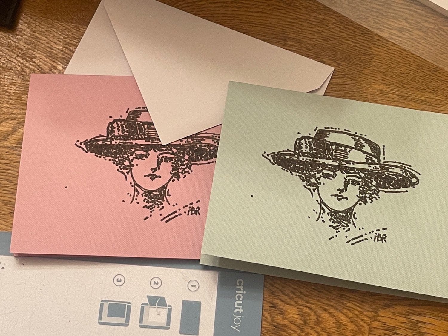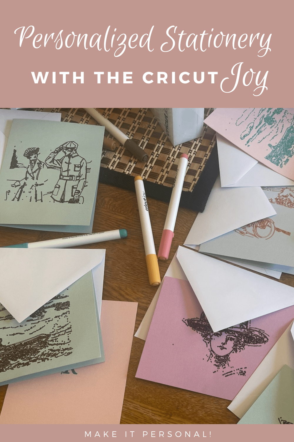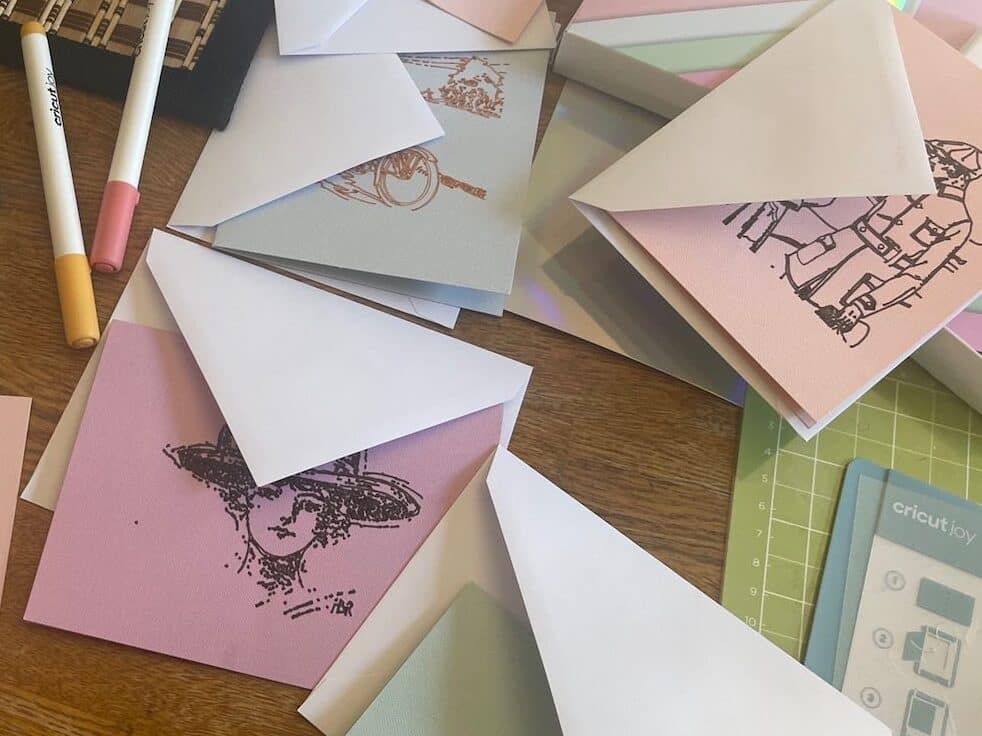 Do you have a Cricut Joy? Have you been looking for a new way to make personalized stationery? My Mom recently published a book that includes the story of my great-great-aunt Hallie. One of the jobs Hallie did in the early 1900s was drawings for fashion magazines and newspapers. I decided that it would be fun to take some of those sketches and put them on stationery for Mom to use when she is corresponding about her book. Here is how I created personalized cards using the Cricut Joy and markers.