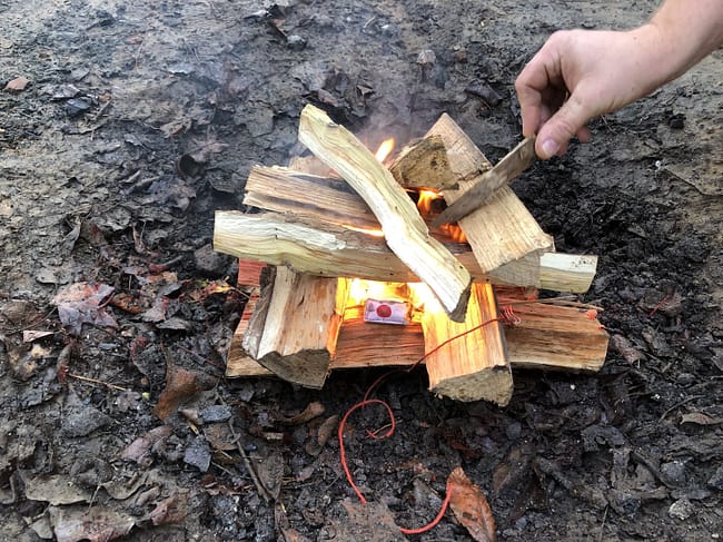 You simply loop the green string around one log, stack a few more pieces of wood on top and then pull the red string. There is a quick spark and your fire is started.