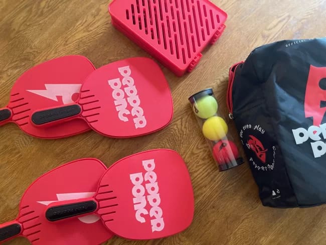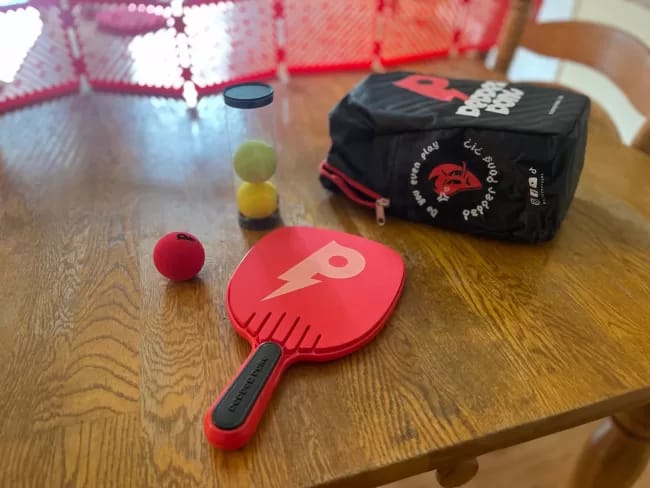 Pepper Pong can be played on any flat surface, such as a dining table, picnic bench, floating dock, or even the hood of a car. Using a free-standing fence, players use specially designed rackets to hit a uniquely designed ball over the fence to score points. The learning curve is low enough that anyone at any skill level can play, yet can still be advanced enough that even pickleball pros can love it. Its pacing, rules, and scoring are similar to pickleball and the specially designed ball leads to long, competitive rallies.