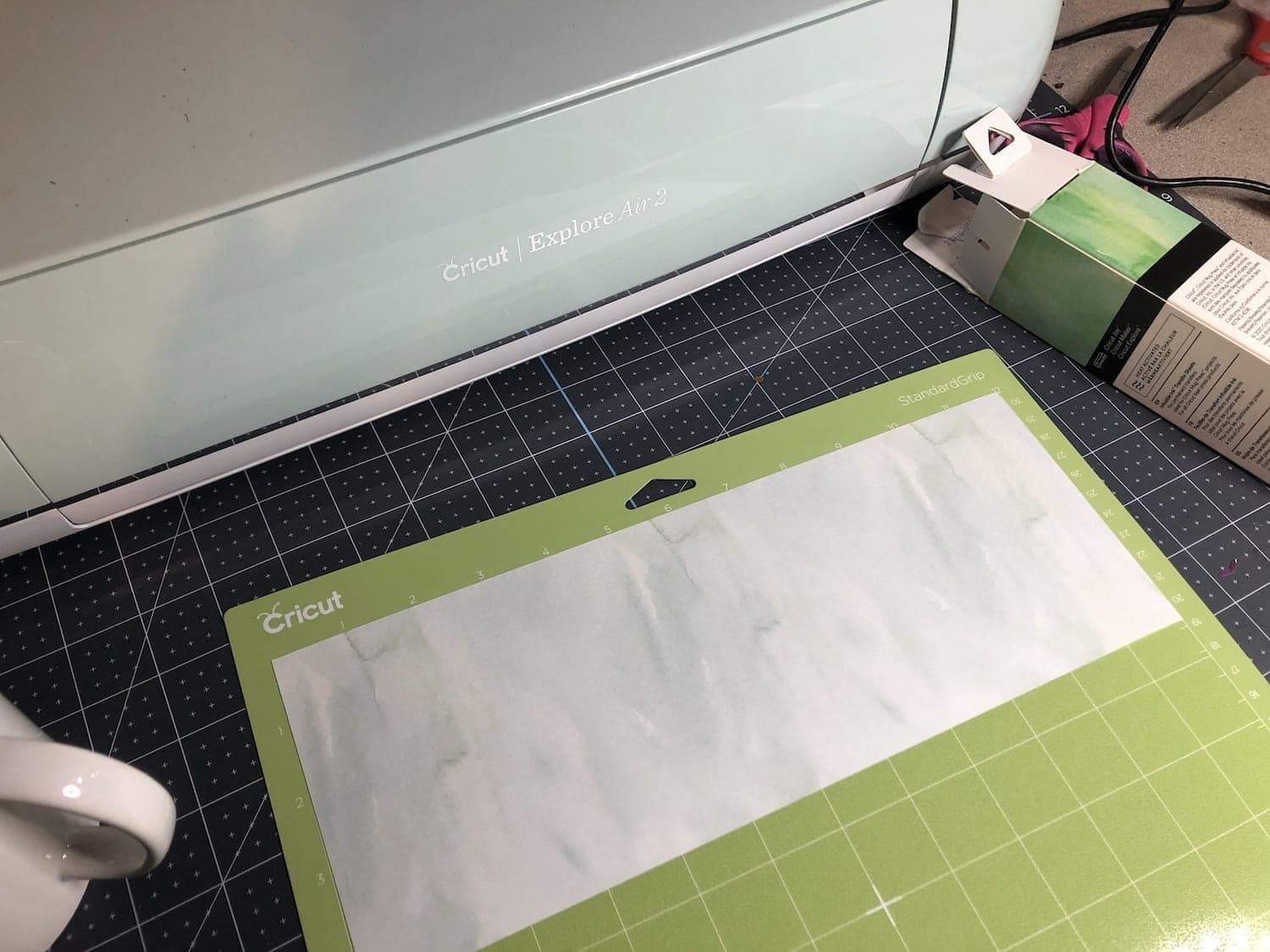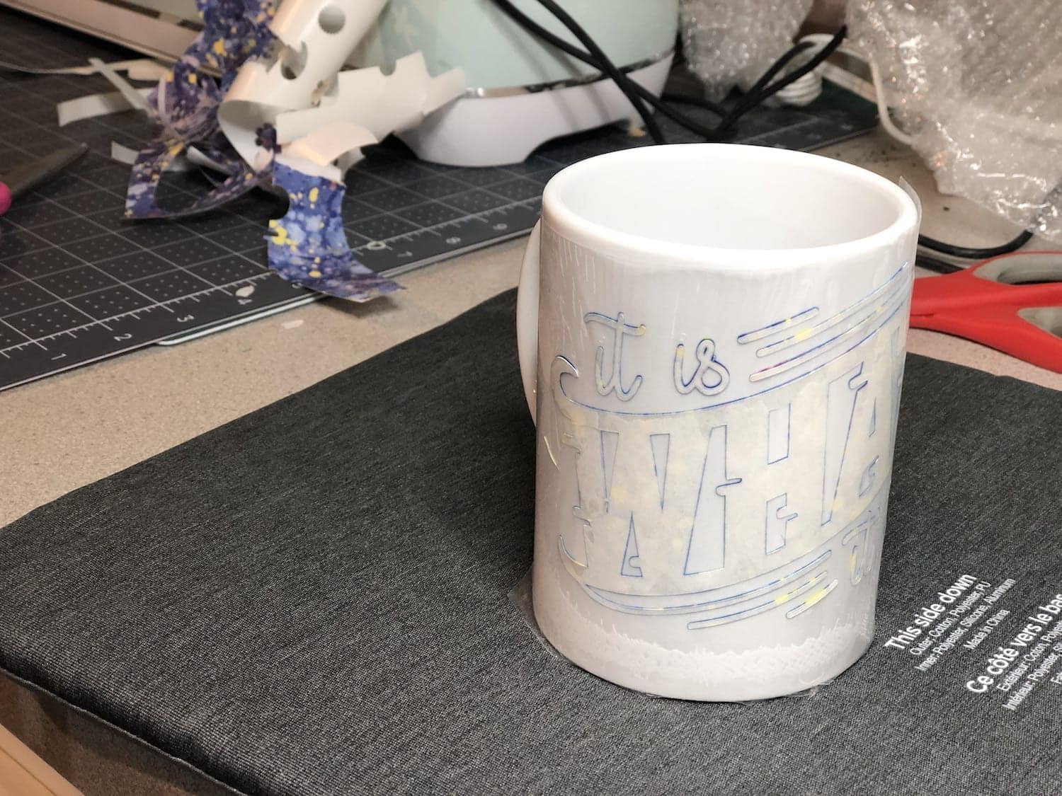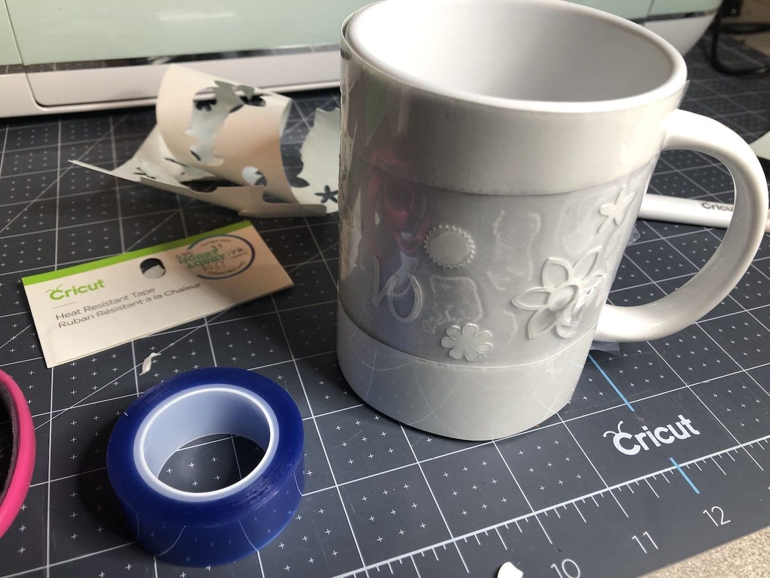 Make sure your cup is clean of dust and debris and then attach your design. Use pieces of heat safe tape to help secure your design on your mug.