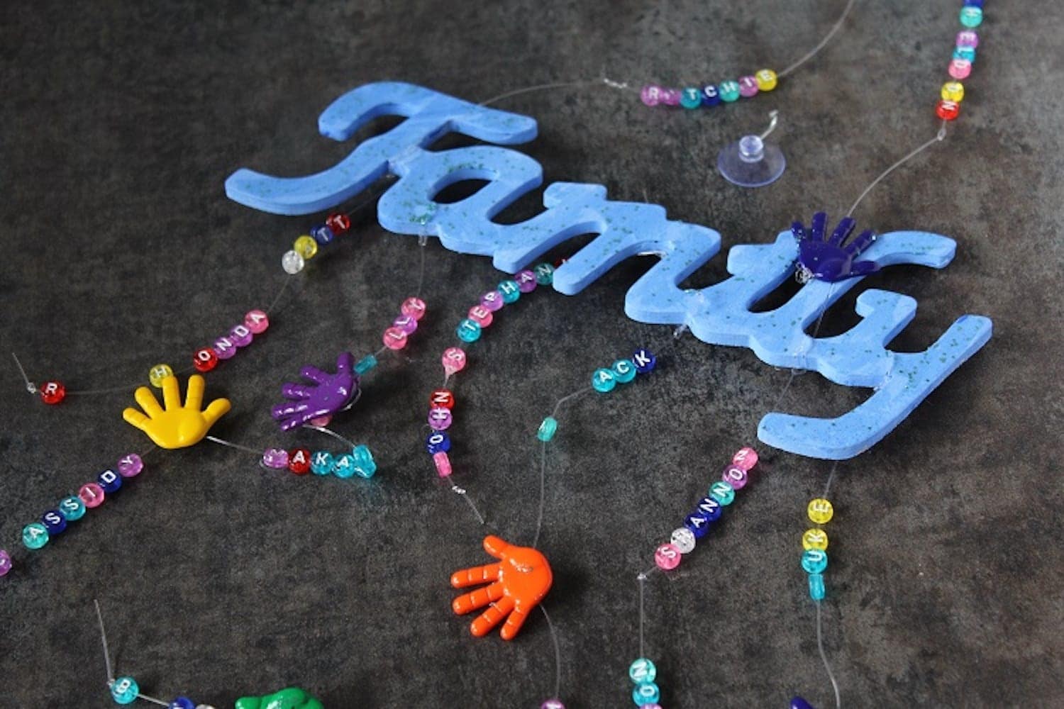 Years ago I made this family suncatcher for my Mom using lettered beads to spell the names of her kids and grandkids. It still hangs in her window as a reminder to pray for each of her family members every time she sees it.