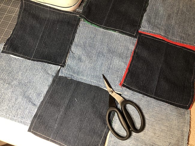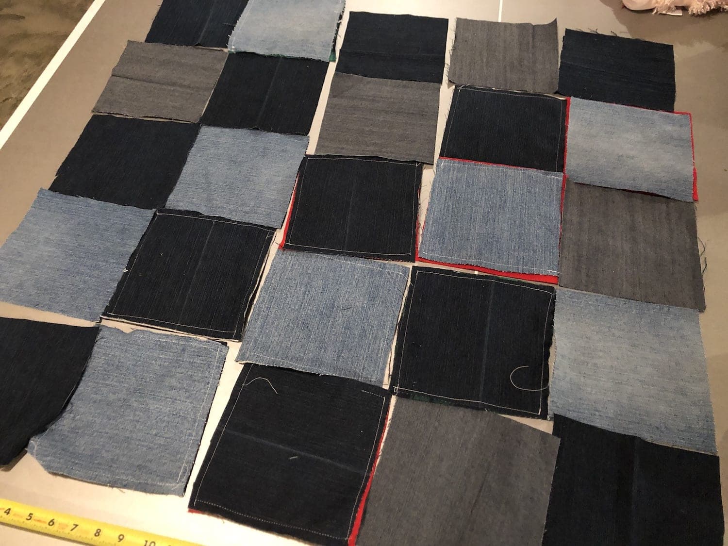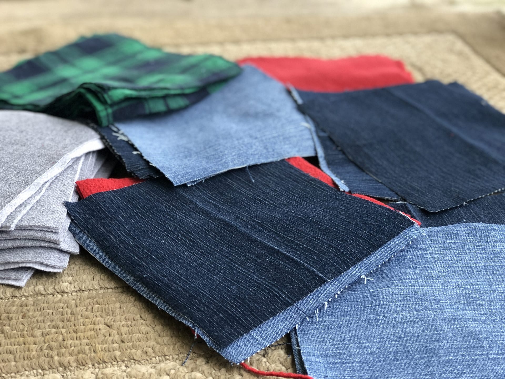 - Gather your blue jeans and flannel squares.
