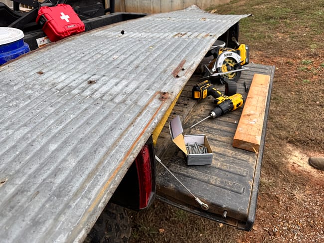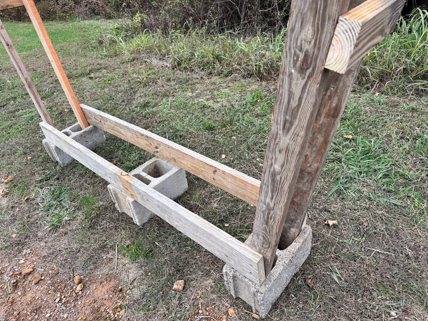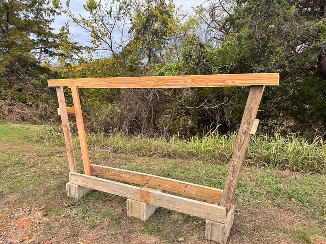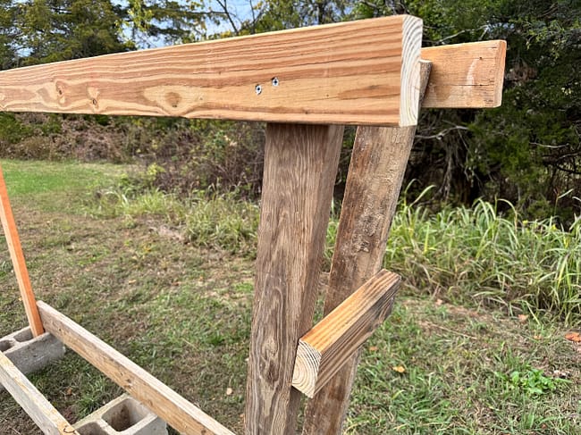 To make the rack, we used the concrete blocks as the base and 2x4s as the side braces. Two beams across the top hold everything together and support the tin roof. If it feels a little wobbly, just add a few short pieces of 2×4 to the ends for extra stability.