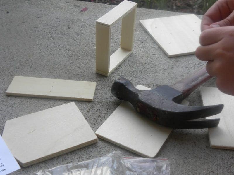 Each birdfeeder kit comes in its own plastic package with the nails and precut wood pieces you need to build a birdfeeder as well as instructions and illustrations. The kits are easy to assemble but do require adult supervision since the kids are going to be using a hammer and nails.