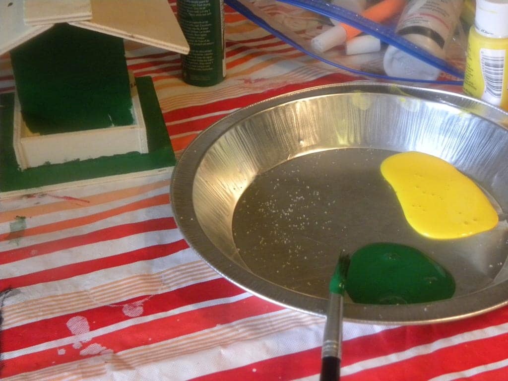 Once the birdfeeders are built, the painting fun begins. Give the kids a brush and a safe surface so they can get started turning the wood into their own personal design.