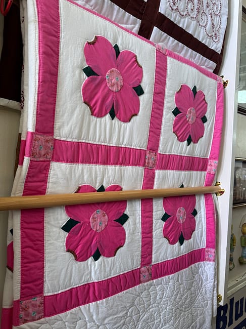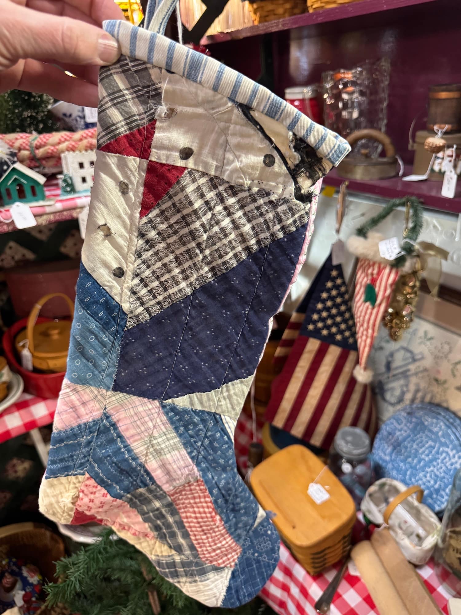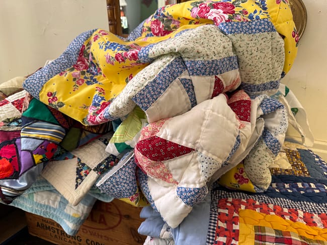 One of the first things I look for when we walk into an antique mall is quilts. Sometimes they’re hung up where you can really see and appreciate the stitching, and other times they’re folded into stacks you have to dig through a little. Either way, I always stop. I love studying the fabrics and wondering about their story. My favorites are the hand-stitched scrap quilts made from bits of old clothing and worn fabric.