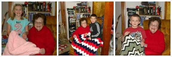 My oldest son with his Great Grandma Grandma and one of her crocheted afghans Grandma’s in progress afghan 2011 Grandma Crocheting years ago on one of her many gift afghans Grandma’s afghan for me when I was in middle school Grandma’s College Gift