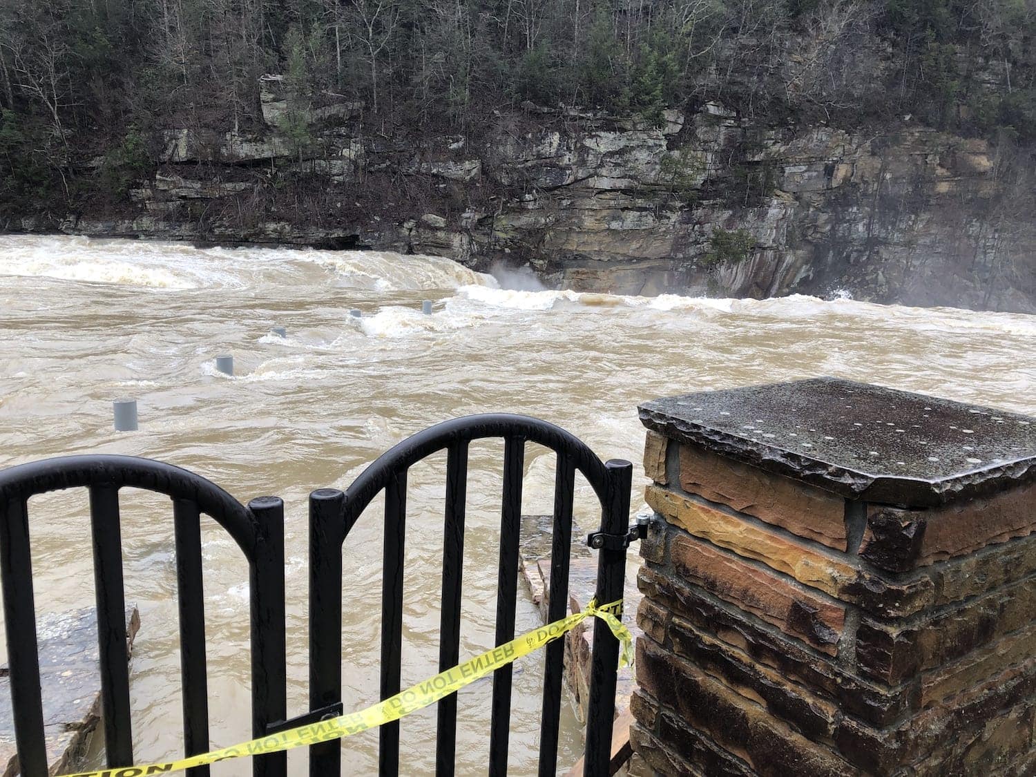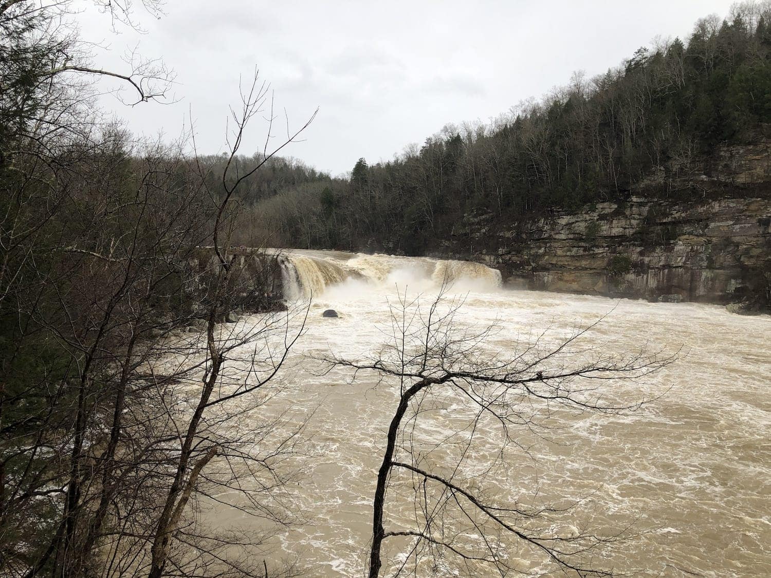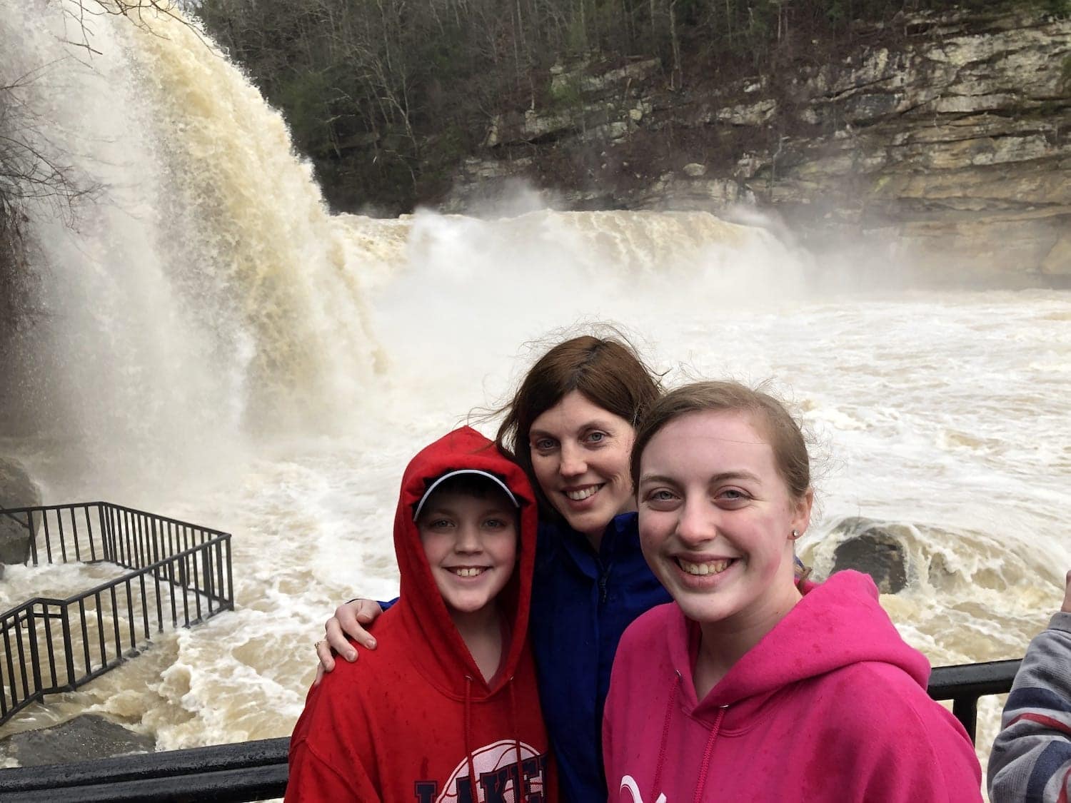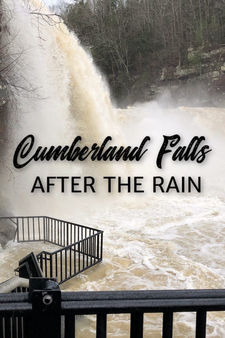 One of the most famous natural attractions in the state of Kentucky is Cumberland Falls in Corbin, Kentucky. Known as the Niagara of the South, this 125 foot wide waterfall is definitely one of our favorite places to hike and explore. Typically when we visit Cumberland Falls, we enjoy the beautiful white water and spray from the Falls. But when we visited today after some heavy rains in Kentucky, we saw the Falls like we’ve never seen before.