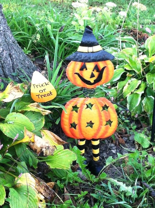 I received this pumpkin Halloween decoration that wobbles to put in my flower garden. It is a fun way to welcome trick-or-treaters as well as the family each time we enter the house. Metal. 13″ x 20″ © OTC