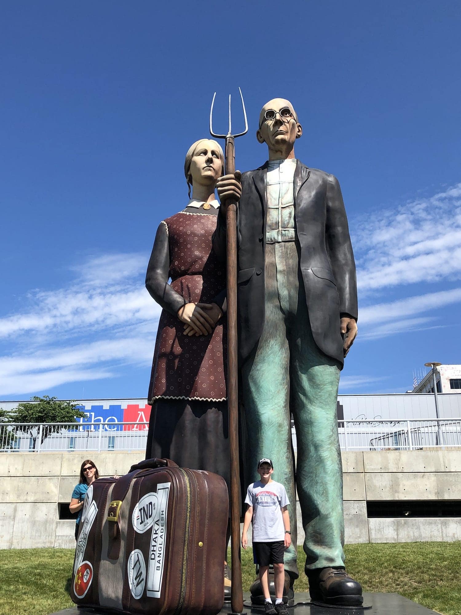 Inspired by Grant Wood’s iconic painting “American Gothic,” the 25 foot tall, 32,000 lb farmers are currently on display in Peoria, Illinois.