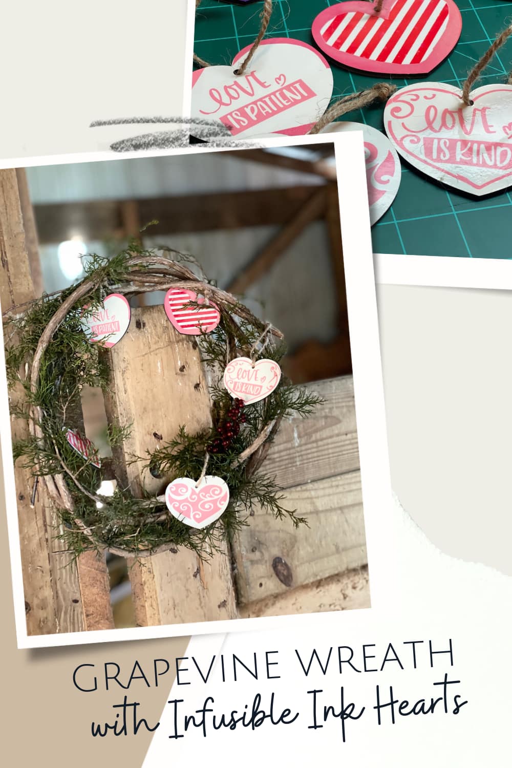 Last year I brought back a grapevine from the farm and made a door wreath for the holidays. When I wanted to create a simple Valentines Day themed wreath for my door, I took that same grapevine, added some fresh cedar, and attached some infusible ink hearts to complete the look. This easy rustic, grapevine wreath gives me a pop of the February holiday with minimal time or effort. Here are the steps to create your own Infusible Ink Valentines Day wreath.