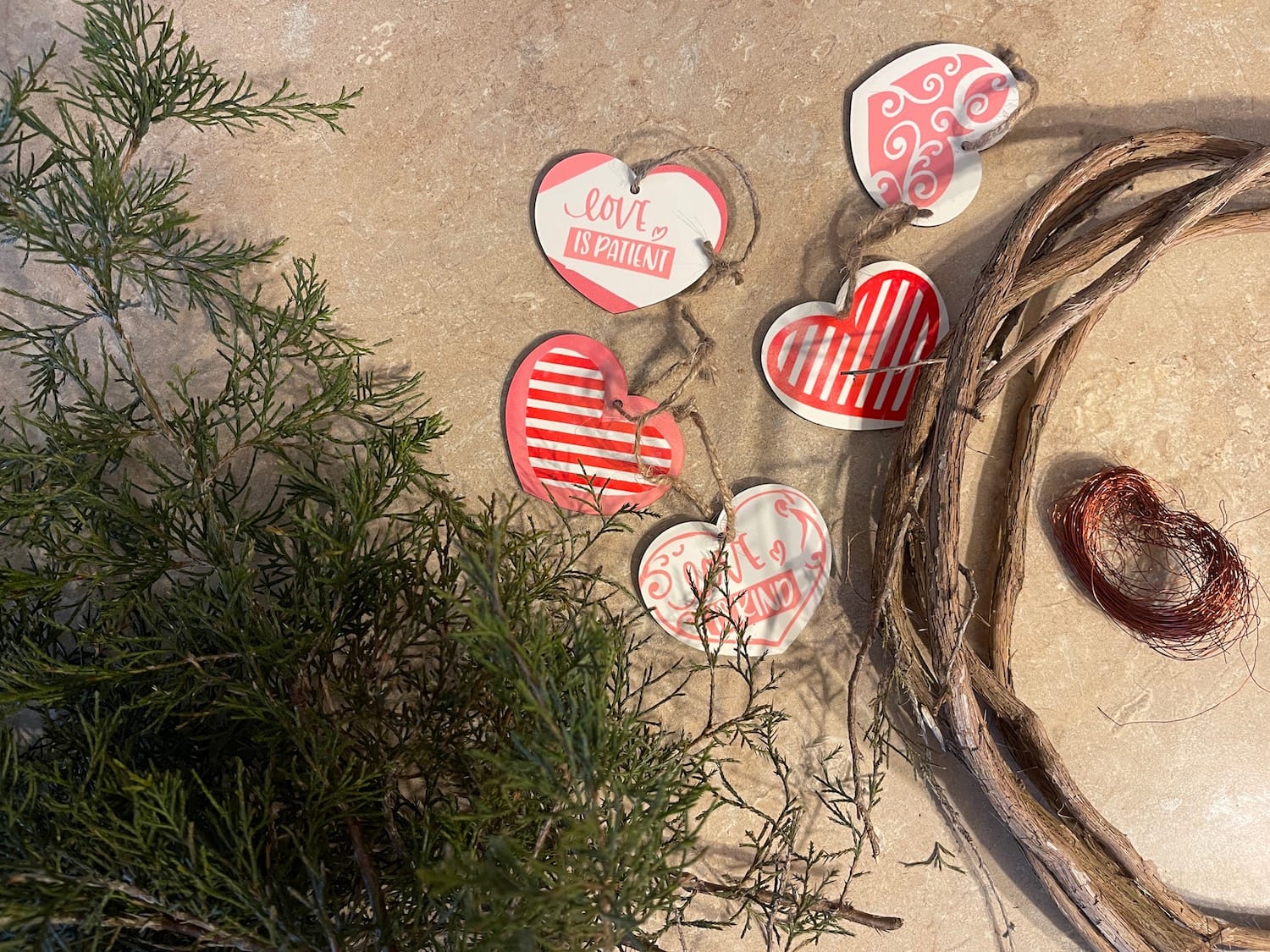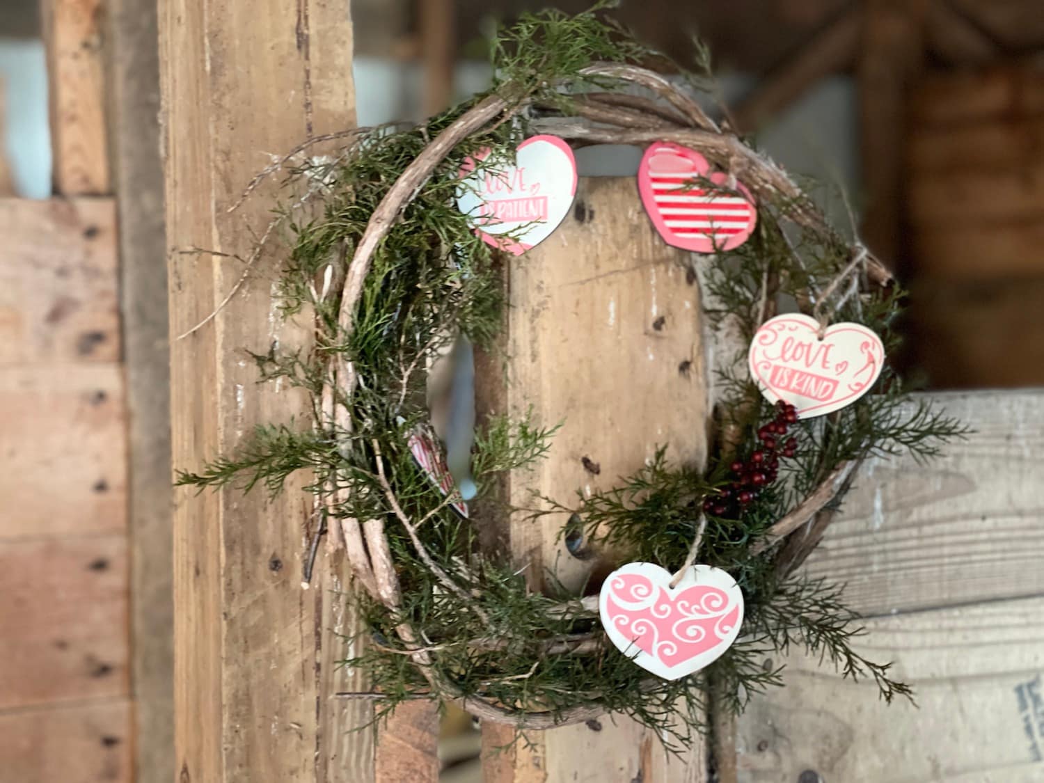 Add fresh cedar to your grapevine wreath and attach your new hearts to the form using hooks or craft wire.
