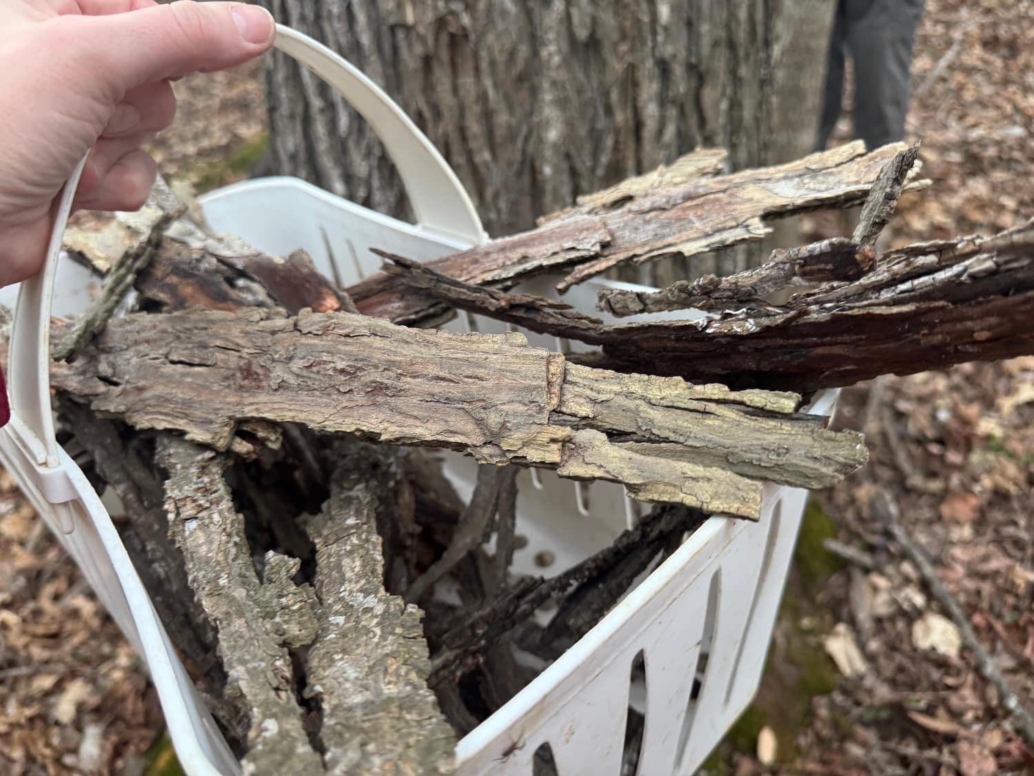 Shagbark hickory trees are super easy to identify thanks to their peeling, shaggy bark. We didn’t strip the trees—just gently picked up a few dry, loose pieces from each one.