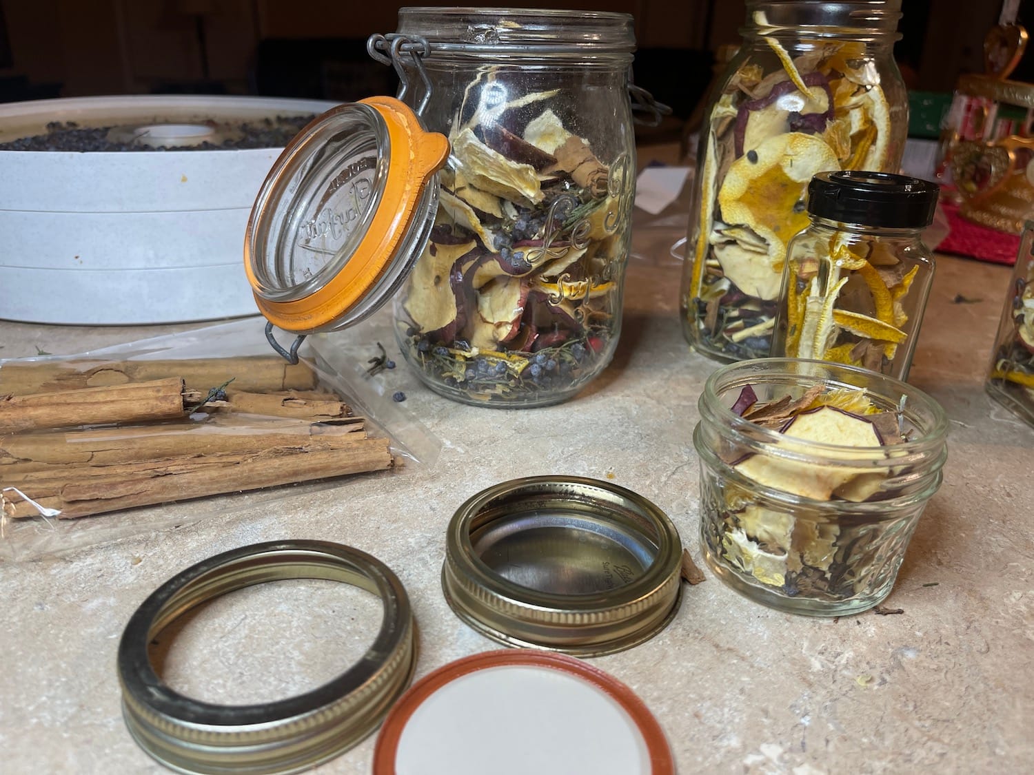 Tip: Save extra jars throughout the year so you can use them for gifts. Canning jars with cracks or lids you can’t reuse are perfect for repurposing into potpourri gift jars. I also save empty spice jars that are perfect for these gifts!