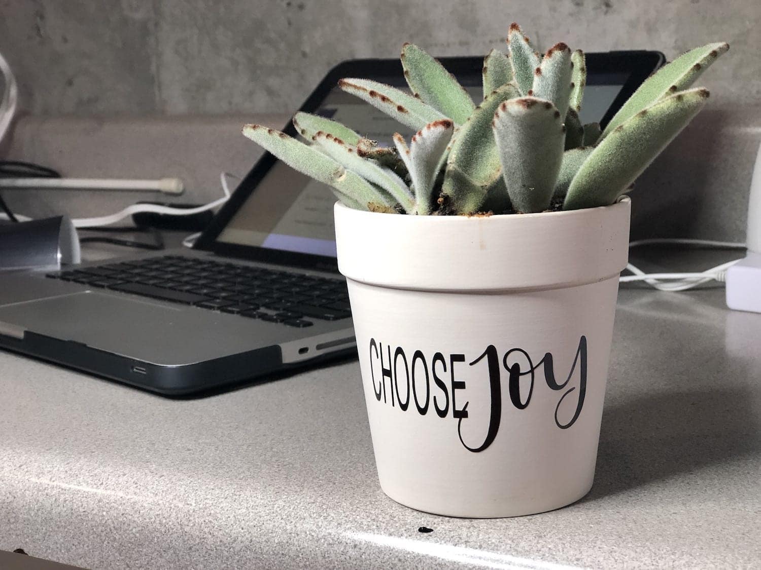 I have a succulent that came in a simple terracotta pot. Since it sits out where I can see it every day, I decided to use my Cricut and design a vinyl phrase for 2021.