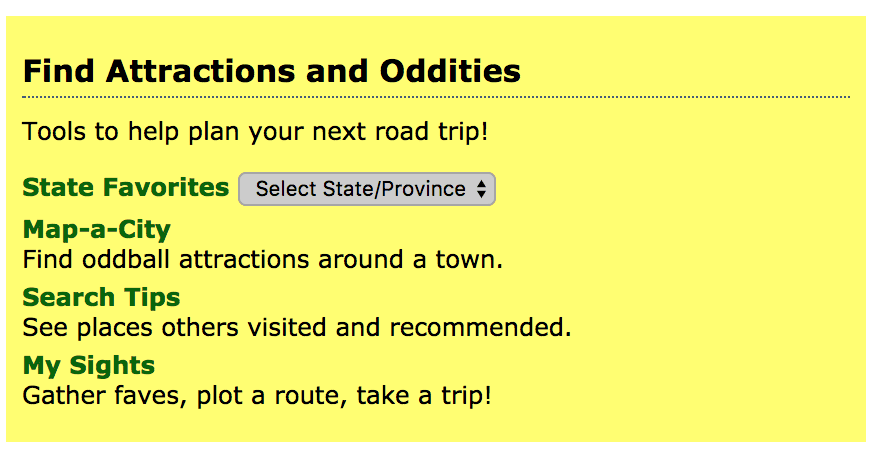 There are several sites that help me find these offbeat roadside attractions. Here are the three main sites I use for trip planning.