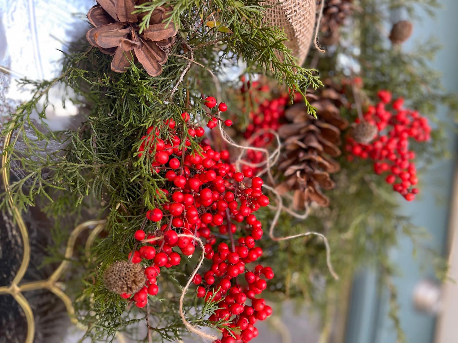 Continue to tuck in the cedar until you have the fullness you want. Then start adding in the red berries and attach the burlap bow.
