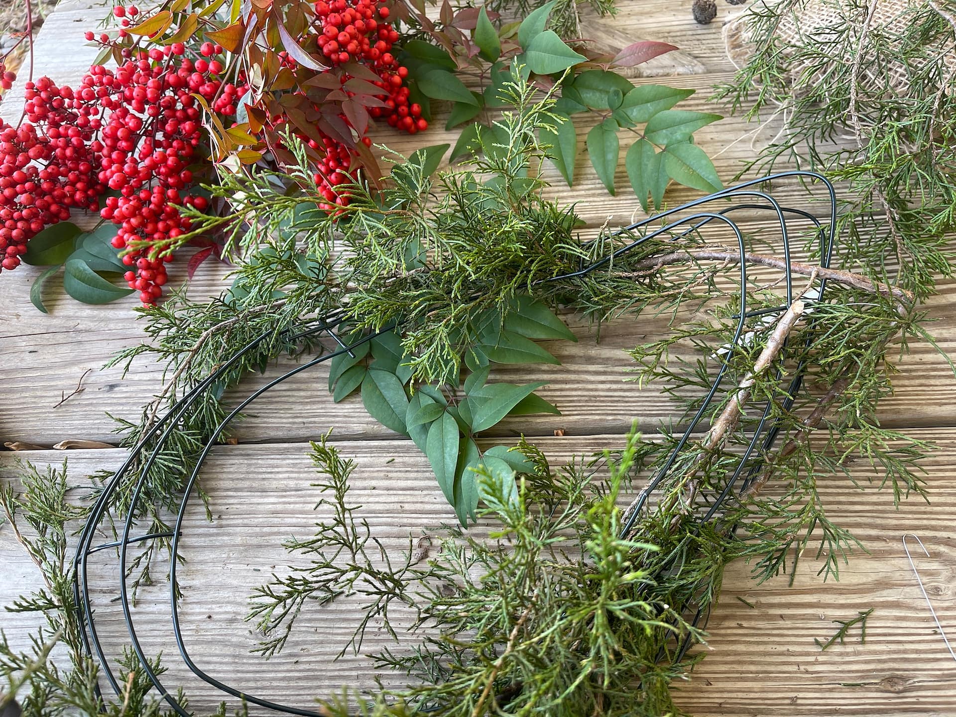 Gently tuck the longer strands of cedar into the wire wreath. (I wanted my wreath to be tall instead of round, so I simply bent the wireframe into the desired shape.)