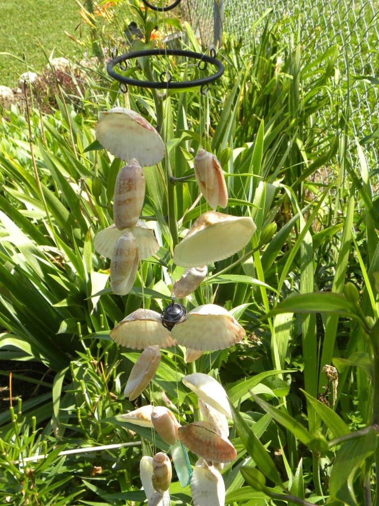 We collected some amazing seashells while we were in Florida. Since I love my flower gardens and we had tons of shells, we decided to try to make a seashell windchime. My husband got out the drill and put some holes in the shells. (Remember that I don’t touch the power tools. I don’t have a good track record with them.)