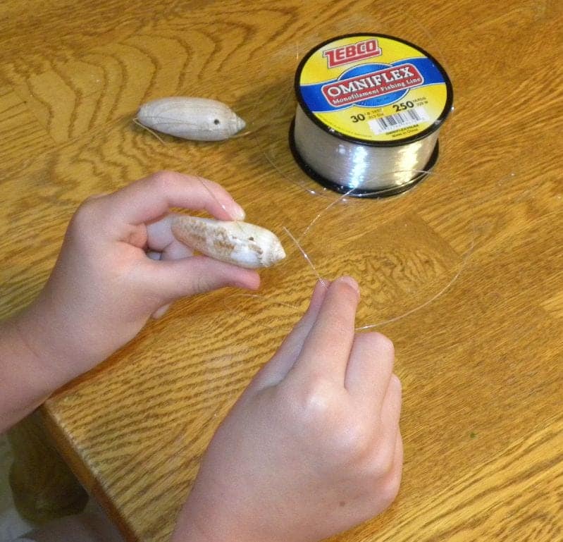 We strung the shells on 4 lines. We decided to use 30 pound fishing line for our string.