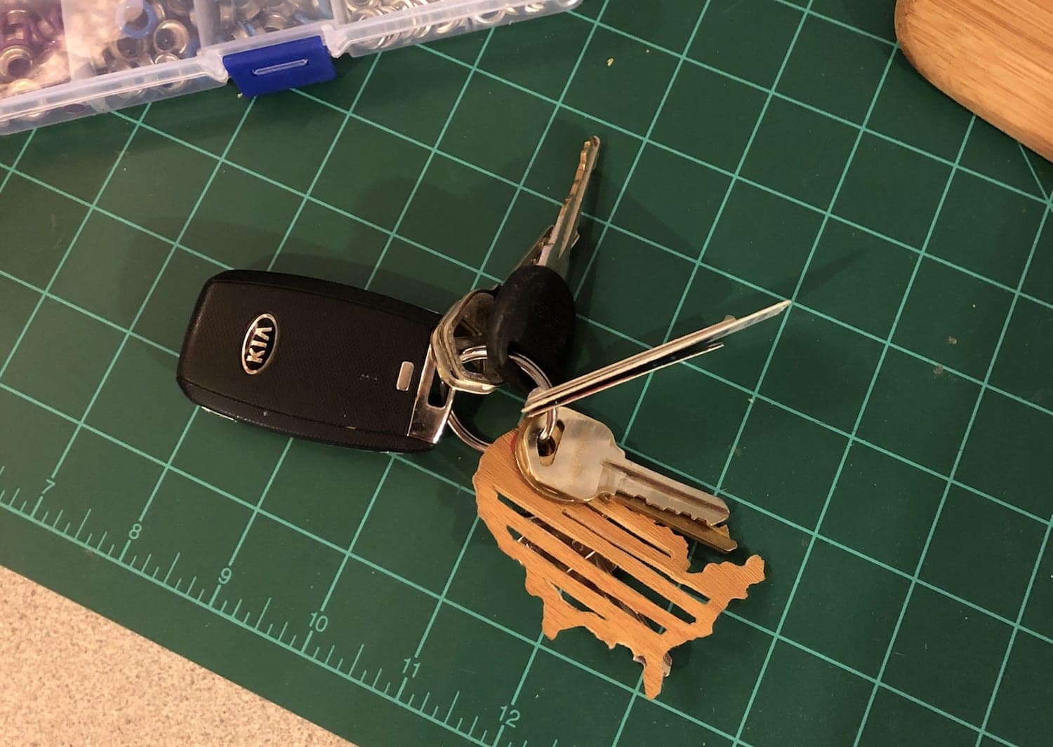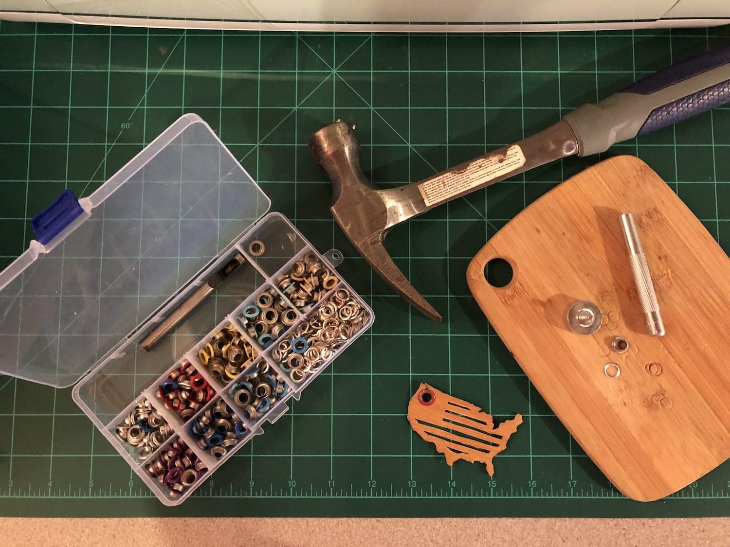 - Punch out a hole with your grommet kit and attach the grommet for your key ring.