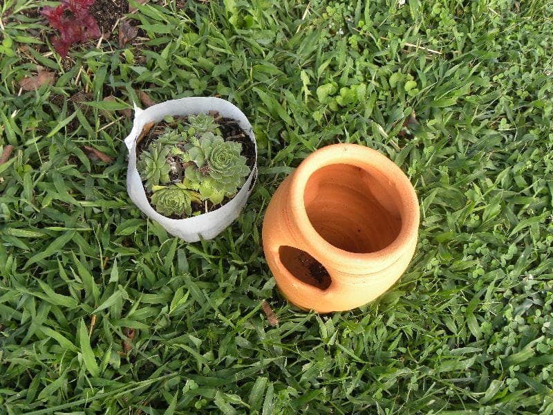 I had a hard time finding a terra cotta pot for my starts. I finally found a 1 gallon pot for less than $5.00 at a gardening store nearby. I came home and dug a shovel of gardening soil and filled the pot. I added a start of the hens and chicks in each opening. Now I am just enjoying them and hoping they will grow.