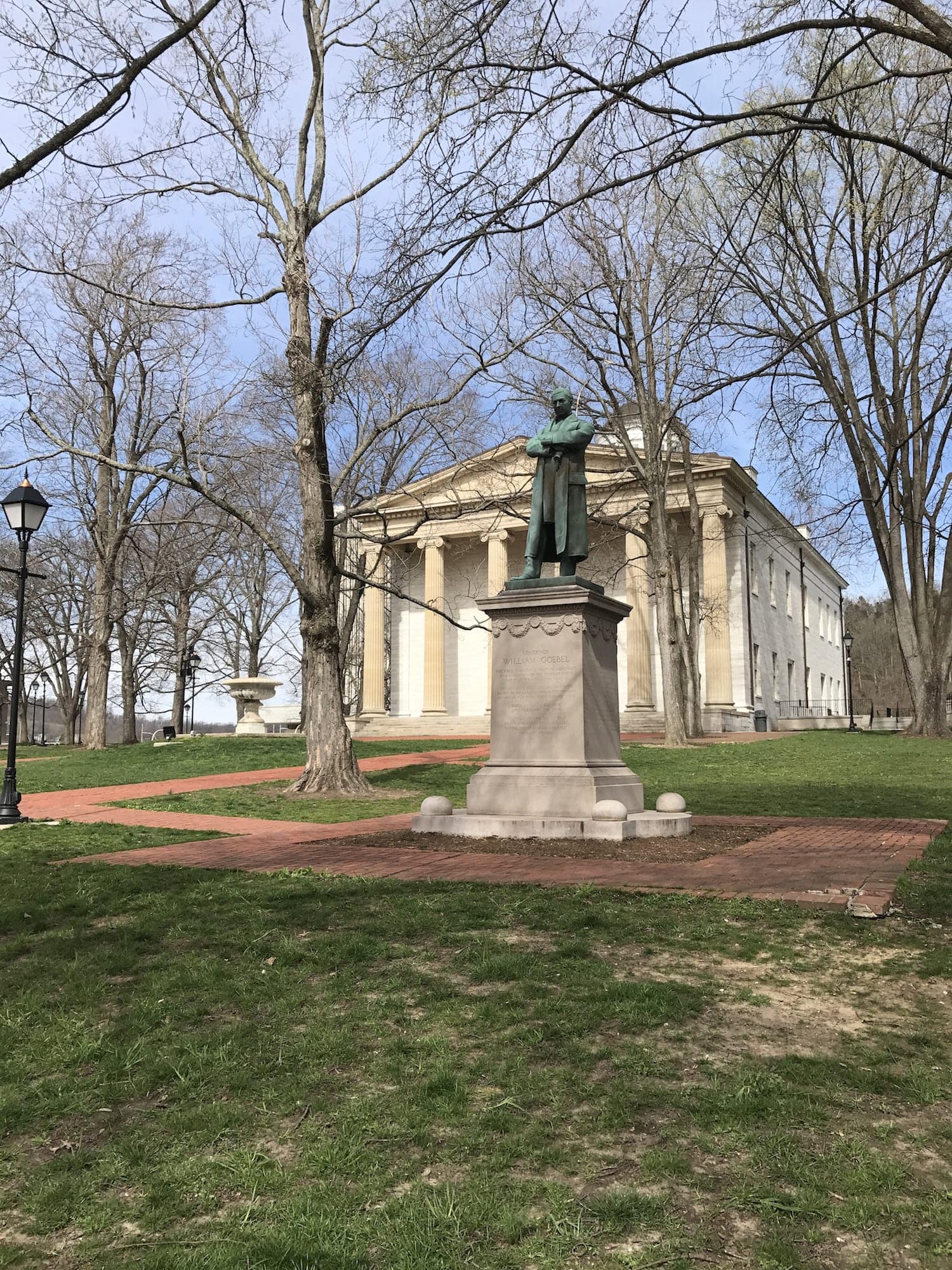 The statue of Governor William Goebel stands in front of the KY Old State Capitol and serves as a reminder of this piece of Kentucky history.