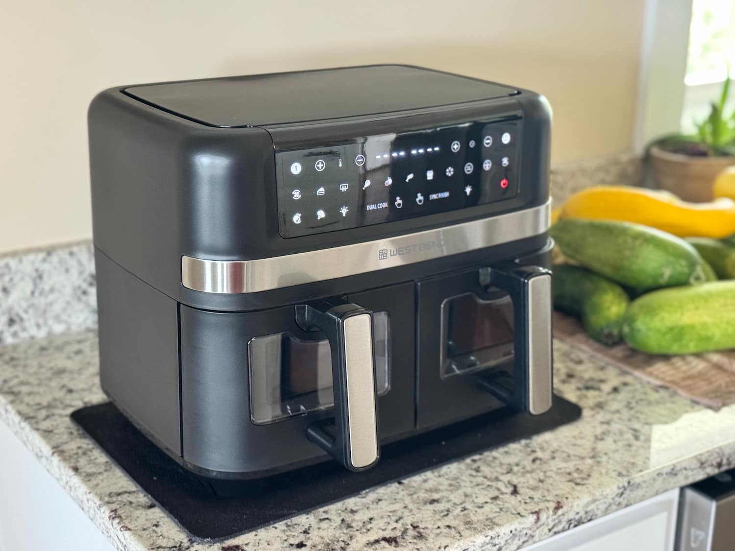 I love that we can cook with less oil, and my family can easily make lunch or dinner even if I’m not in the kitchen. Recently, I upgraded to the West Bend 10-Quart Air Fryer with dual baskets and separate controls. It’s easy to use, simple to clean, and perfect for making two foods at once.