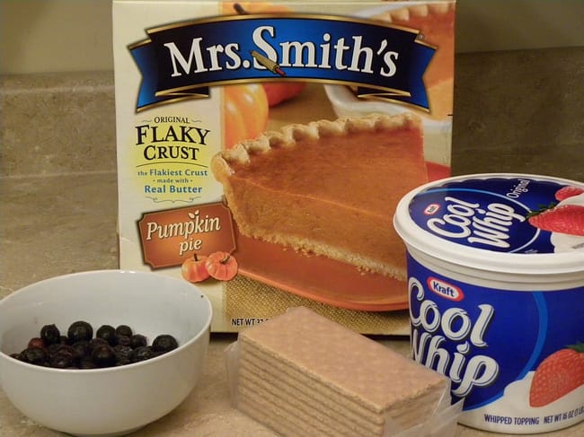 I ran into Walmart this weekend and picked up a Mrs. Smith’s Pumpkin pie from the freezer section. And everyone knows that pumpkin pie must have Kraft Cool Whip! I grabbed a bag of frozen blueberries and a box of graham crackers and I was ready to get this pie in a jar fixed.