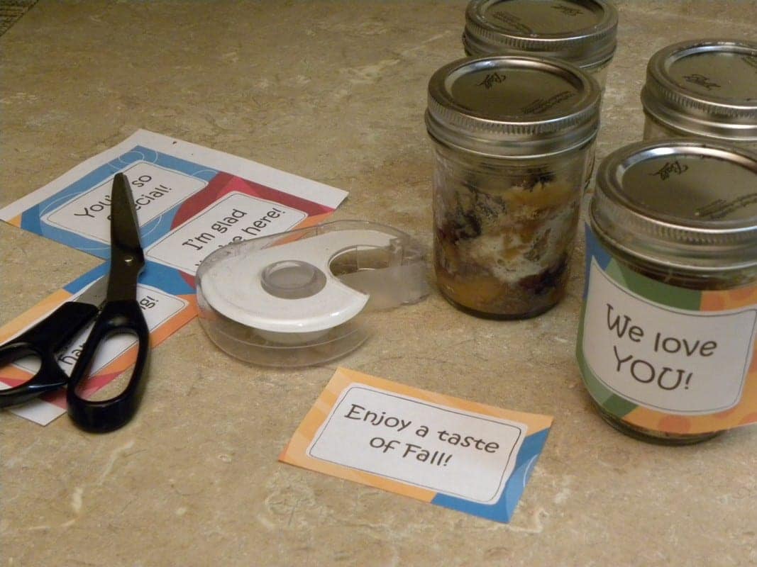 Since we typically do a lot of canning in our household, we always have jars in the garage that are waiting for the next use. I washed out a few of them and started spooning in some of the cooked pumpkin pie.