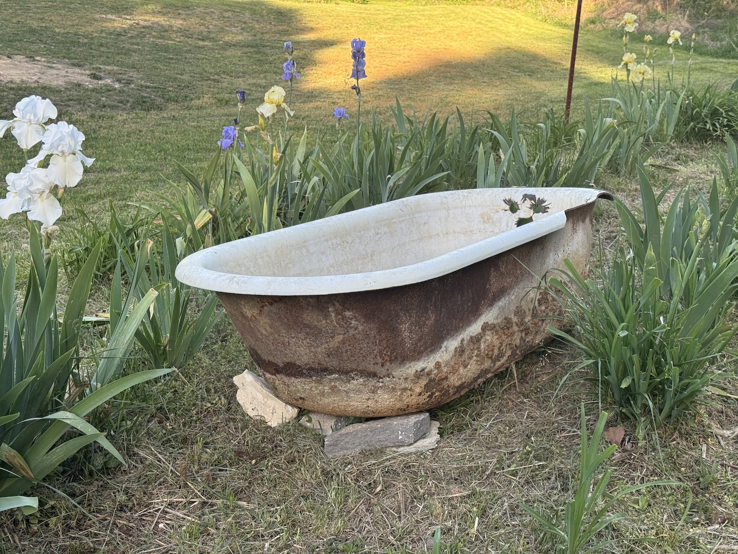 I also want to find a ground cover that will grow up around the base and cover some of the rusty parts. Any suggestions? I want something that will be a bit aggressive and grow quickly this year, and be a pretty base for the bathtub to be sitting in.