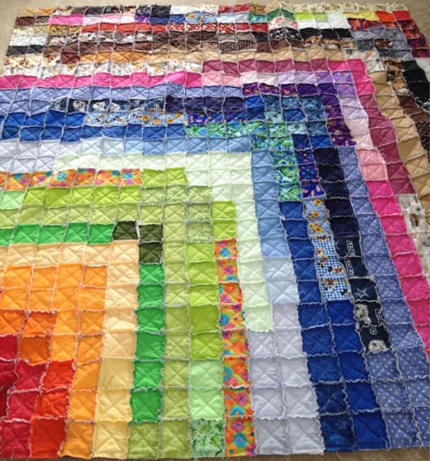 Once you have all your individual squares ready, you just sew all the way around each block. You keep adding the blocks until you have your full size. I actually ran out of the squares and decided the quilt wasn’t large enough. So we then just started making random rectangles and strips around the basic blocks till we used up all our flannel. Because the rag quilt isn’t dependent on a particular pattern, I think we were able to get away with the random design.