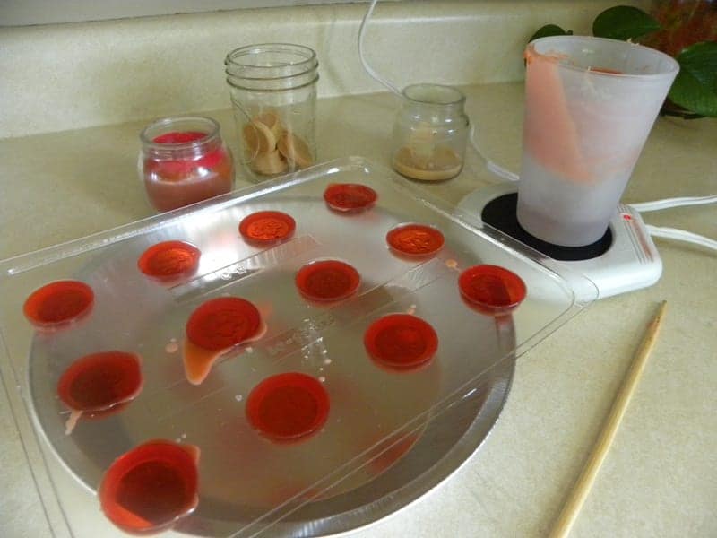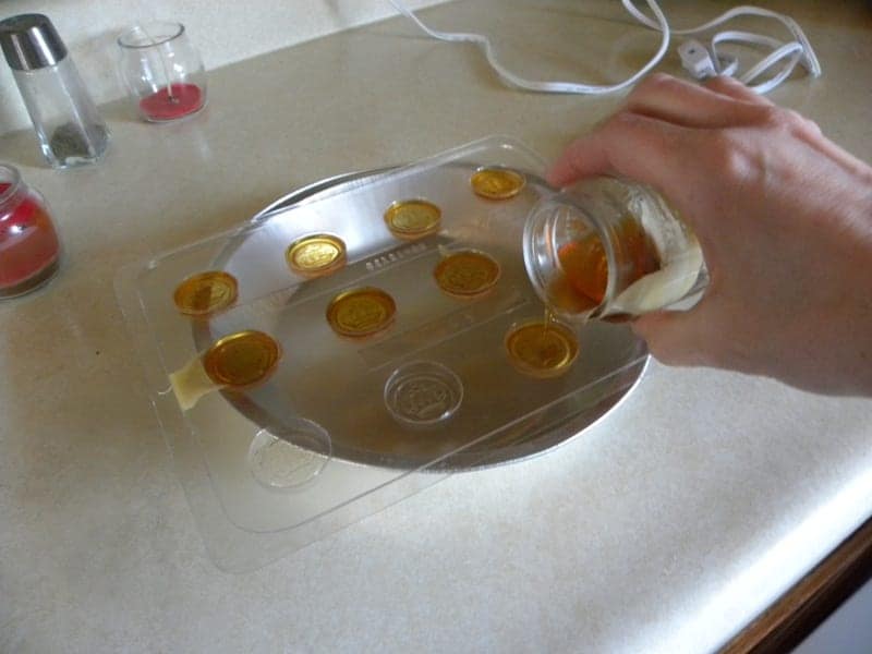 Once the wax was melted, I poured it into the little plastic candy molds. This one I have is in the shape of coins. It is easy to tell when the wax is cooled and ready to take out of the molds because the color changes from the deep, shiny color to a lighter more matte finish.