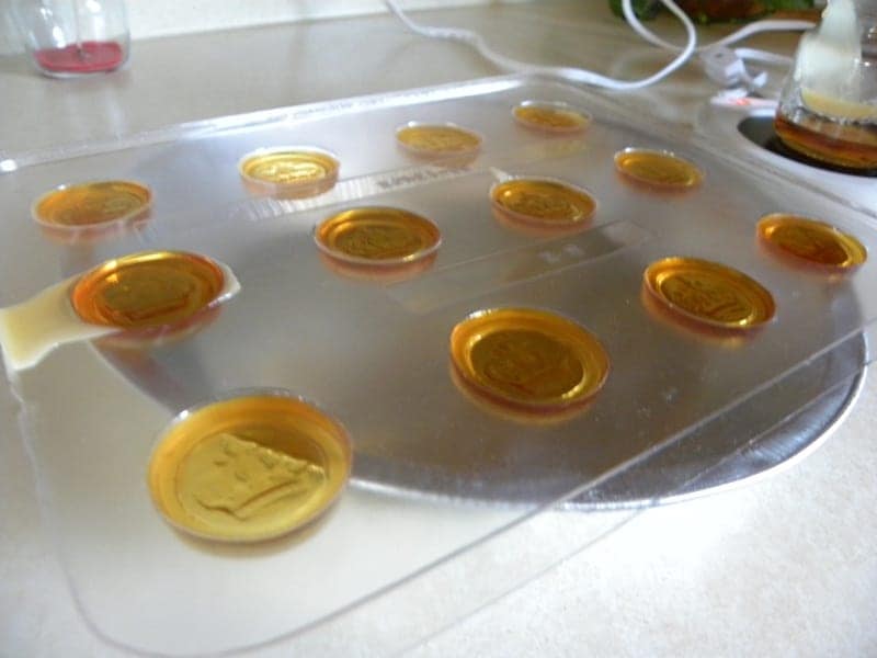 To get the wax coins out of the plastic mold, just tap the edges with the back of your hand or pop them with a little twisty motion. Once they were cooled, they popped out easily.