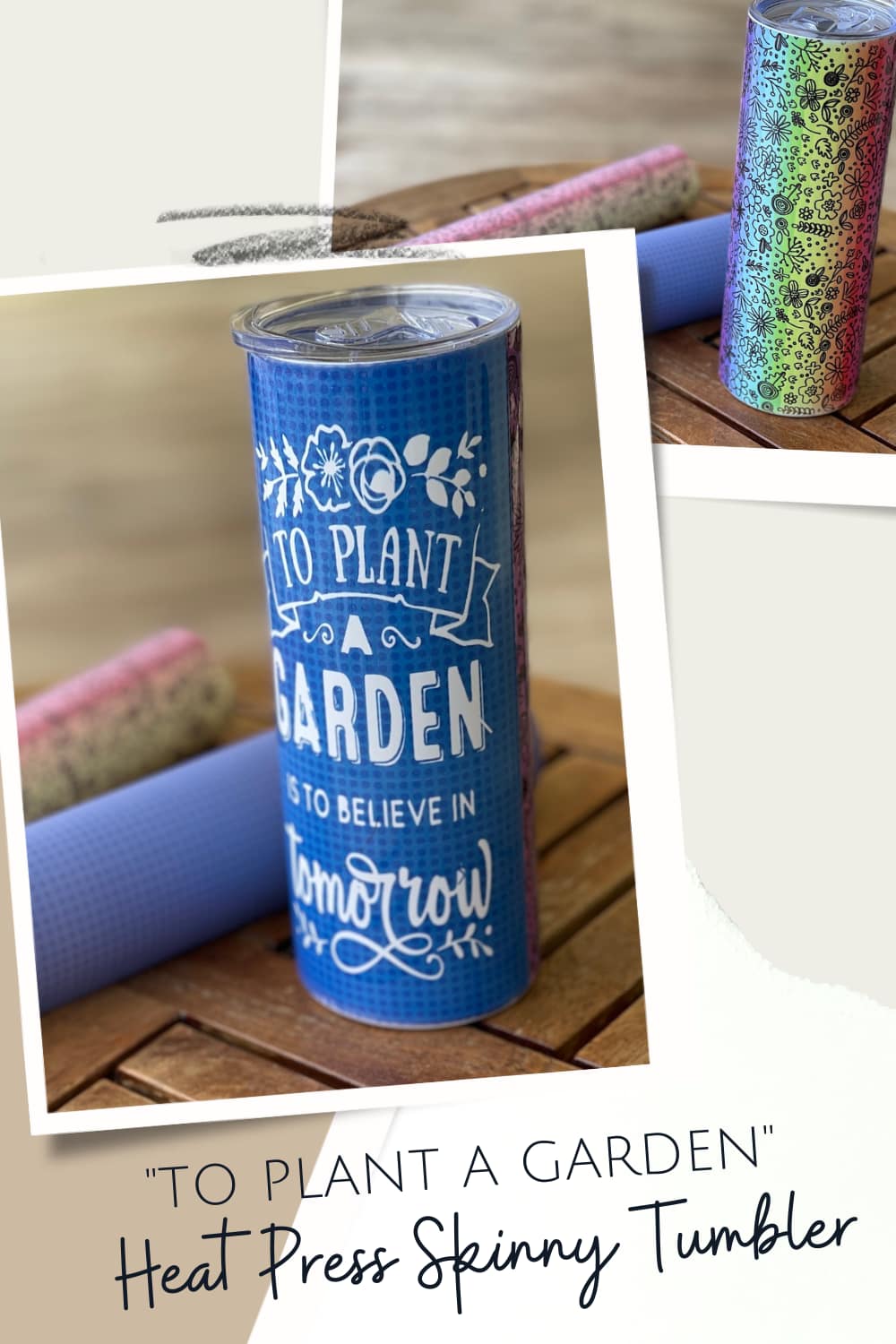 I love the quote by Audrey Hepburn that says “To plant a garden is to believe in tomorrow”. Every time I plant seeds, I think of the act of faith and hope that is required. It’s often impossible to imagine that something so tiny as a seed can produce massive amounts of beautiful flowers or tasty vegetables. Each season we start new gardens and show that we believe tomorrow is coming. I decided to put this quote on a skinny metal tumbler so I can share this quote with my friend who also loves to garden. *You can also adapt this design to fit a regular-size coffee mug and use your Cricut Easy Press.