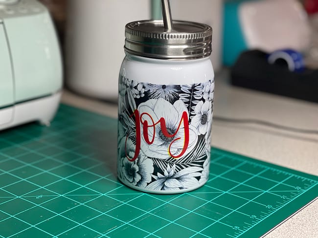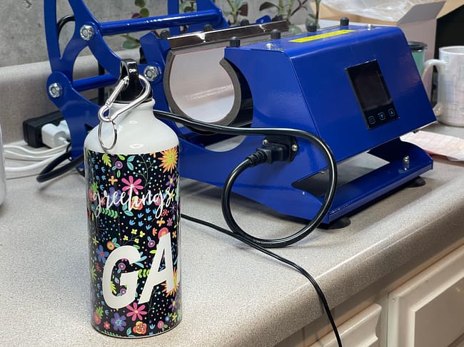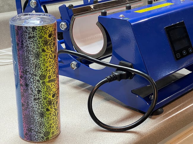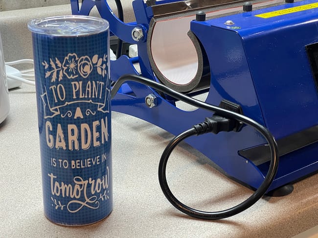Place it in the heat press and hit start. Use tongs or a towel to turn your tumbler after 30 seconds so it will bake the entire design completely. I did this tumbler for 2 minutes – turning after each 30-second beep. Depending on the heat of your press, you may need to adjust your time.