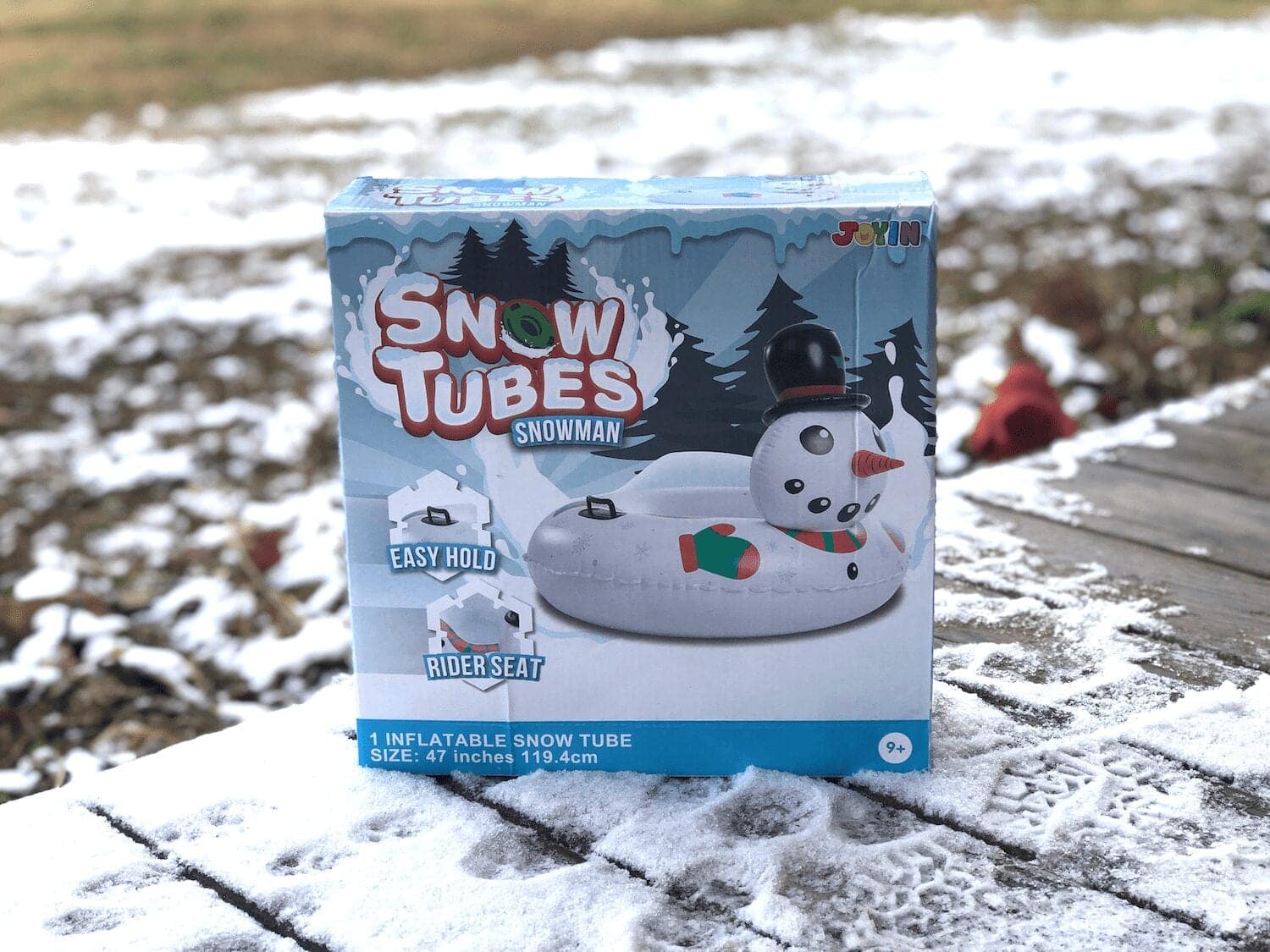 I received this great Snow Tube Snowman in the mail a few weeks ago and decided that this would be a fun way to create some family memories! It arrived on a day when we had just a hint of snow but nowhere near enough to sled down the hill.