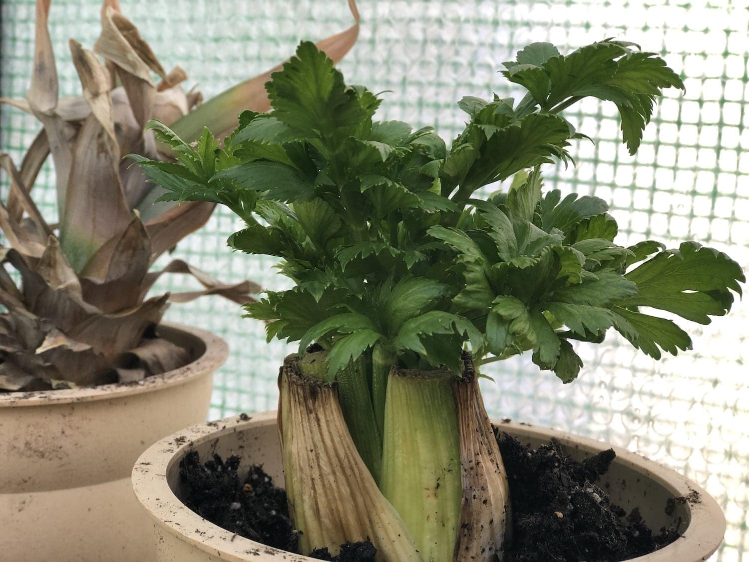 The celery is growing but the pineapple is pretty much a failure at this point.
