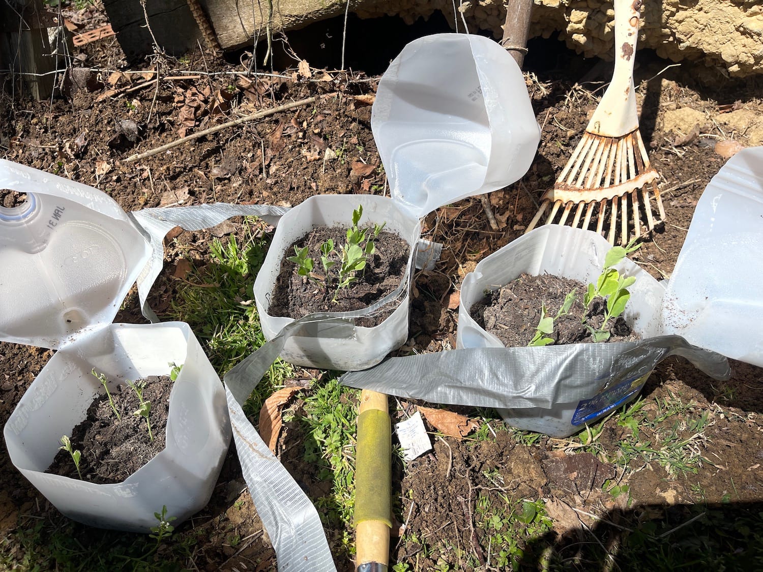 When I pulled back the duck tape and opened the milk jugs, I found that the sweet peas were up about 4 inches and ready to plant.